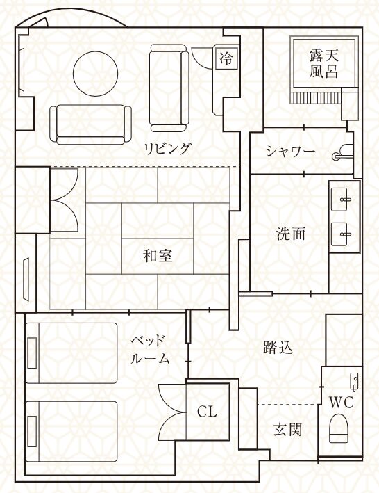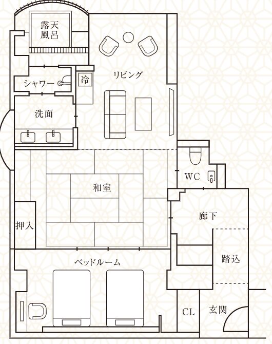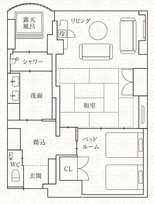 | 部屋の構成 | 客室露天風呂、ベッドルーム、リビング、和室 | ||