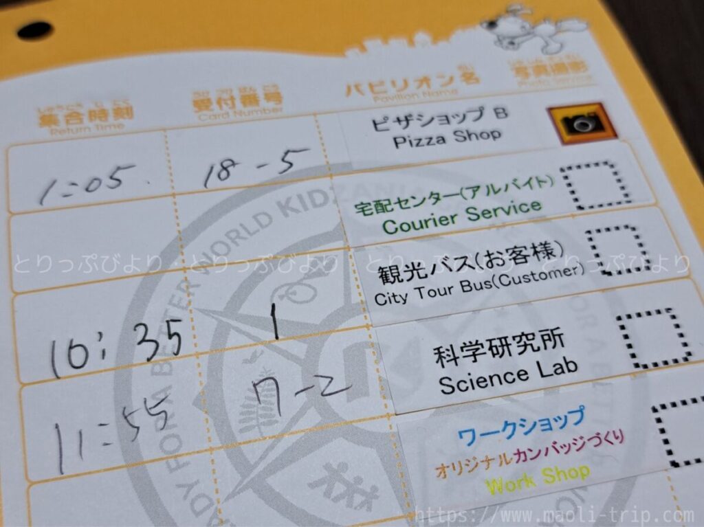 キッザニア入場時に貰える「JOBスケジュールカード」に、時間や受付番号を書いてもらって予約完了です。