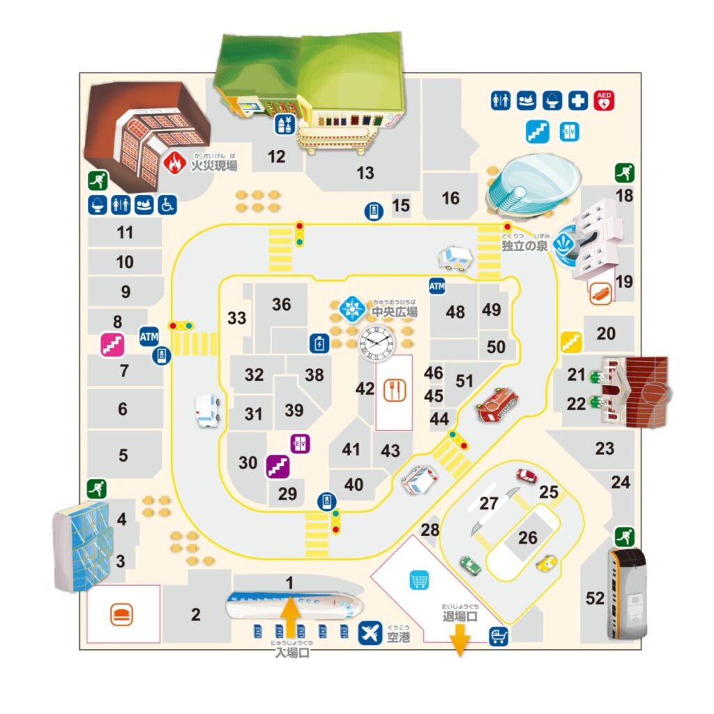 最初はわかりづらいですが、キッザニア内のマップも一緒に見て位置もなんとなく把握しておくと良いですね。