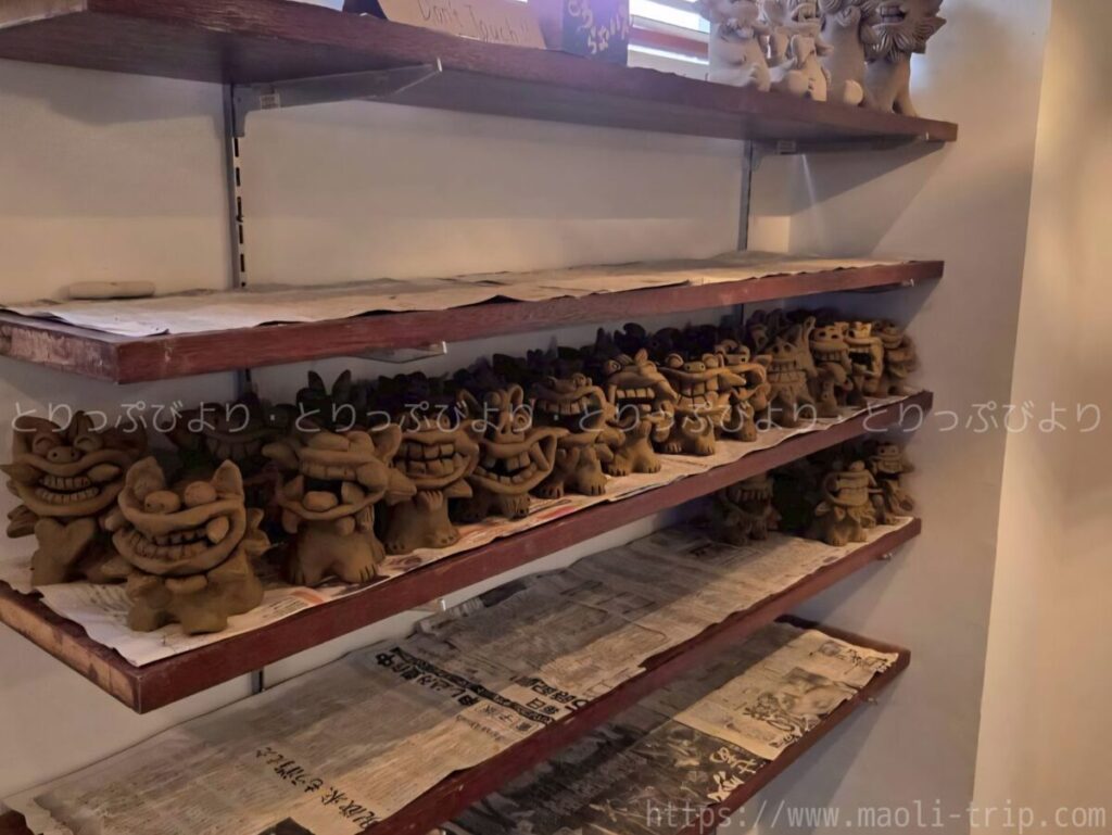 お店の雰囲気 | シーサーが並ぶ店舗の奥にある、落ち着いた制作スペース